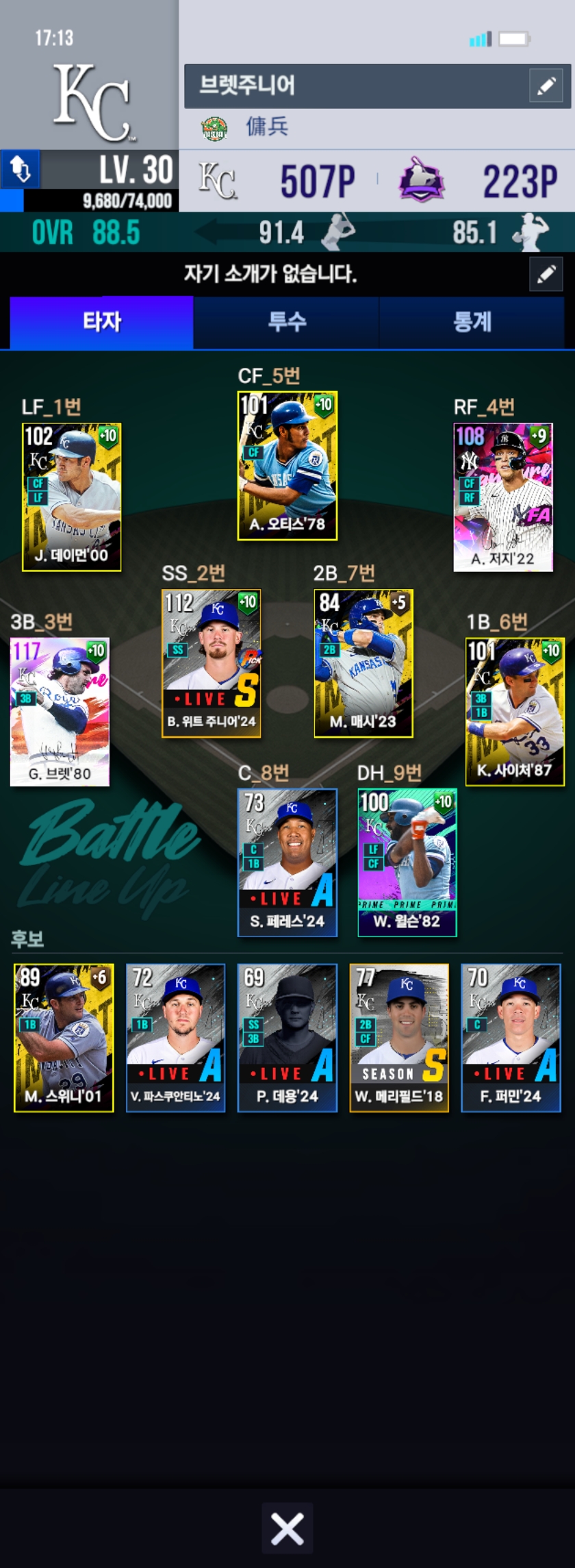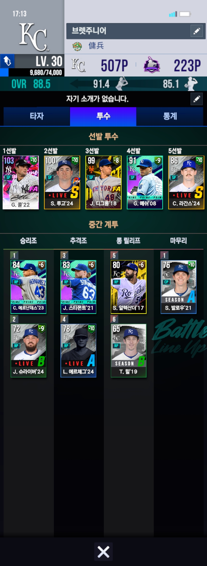 브렛 시그 떠서 시작했고 파저지는 7일접속 fa시그에서 운 좋게떴어요 콜도 양키fa이벤트때 먹었고요 최대한 500 500 고수님들 말 따라서 해보려고 하는데 많이 어렵네요 노현질은 500 500 불가능할까요? 형님들 조언좀해주세요 투수가 너무약햐요