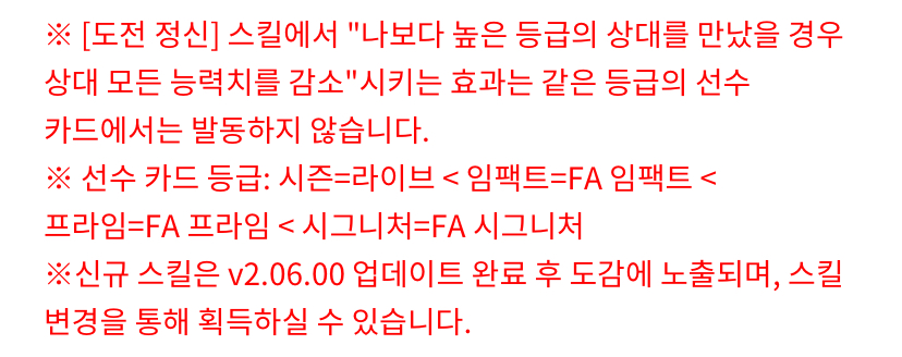 지난번 스킬 개편에서 공식적으로 FA Prime = Prime으로 설명하였으며, 동일 등급의 초월 등급은 서로 전송 가능하다고 안내한 바 있습니다. 그러나 위 이미지에서 보이는 것처럼 초월 등급 전송이 불가능한 상황입니다. 이 오류를 수정해 주시기를 요청드립니다. 감사합니다.