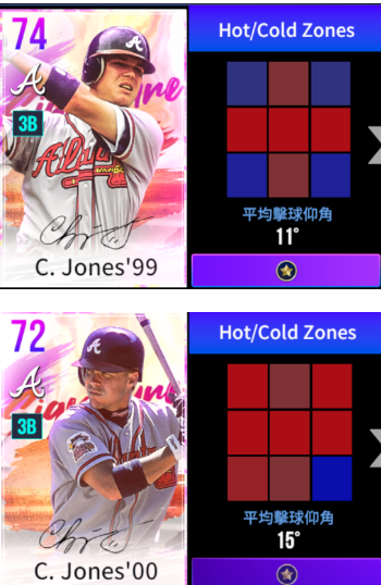 For Hall of Famer C. Jones, his strongest year, the MVP season, has one of the lowest red-blue zone ratings among players with an OVR above 70, alongside another Warriors player, Freeman, as the only two players with four blue zones. Additionally, the red-blue zones are located at the edges, which has a greater impact on the game than on real-life performance. After all, who in the game would consistently hit in the red zone?
