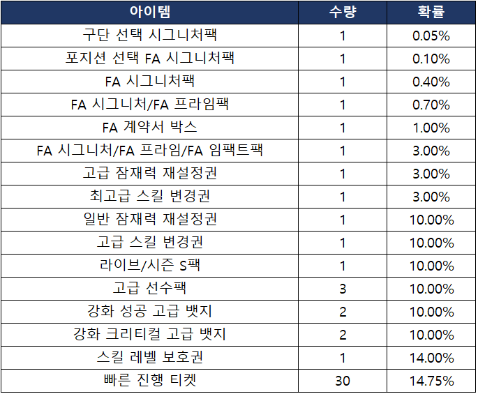 - 아래의 구성품 중 1종을 확률에 따라 획득할 수 있습니다.