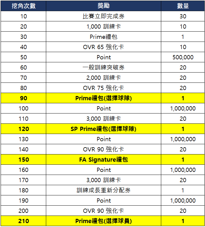- 進行30次挖角時,可獲得「Prime禮包」,進行90次時,可獲得「Prime禮包(選擇球隊)」。