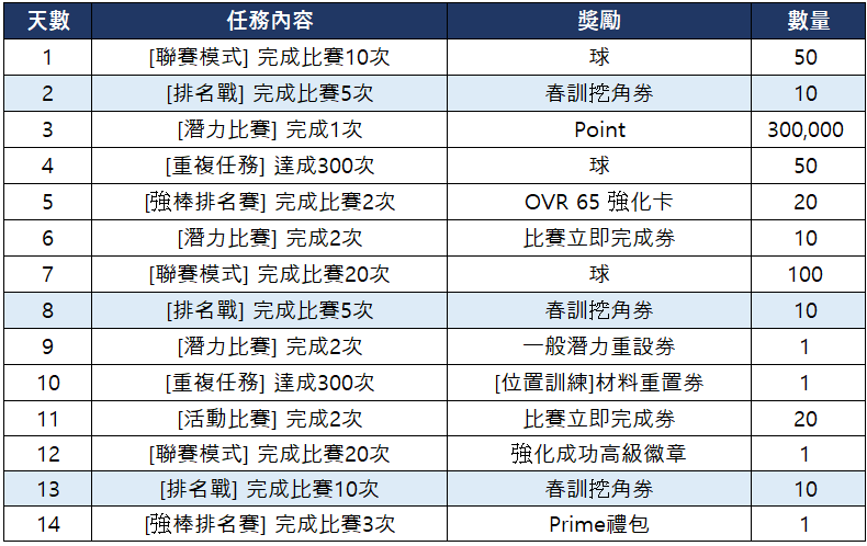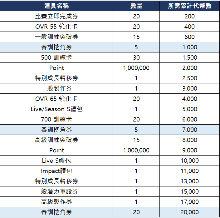 - 根據在春訓活動比賽中獲得的活動代幣累計數量,可獲得階段性獎勵。