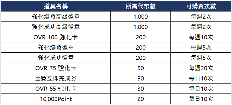 - 可使用強化支援代幣強化球員卡或在活動商店中購買道具。