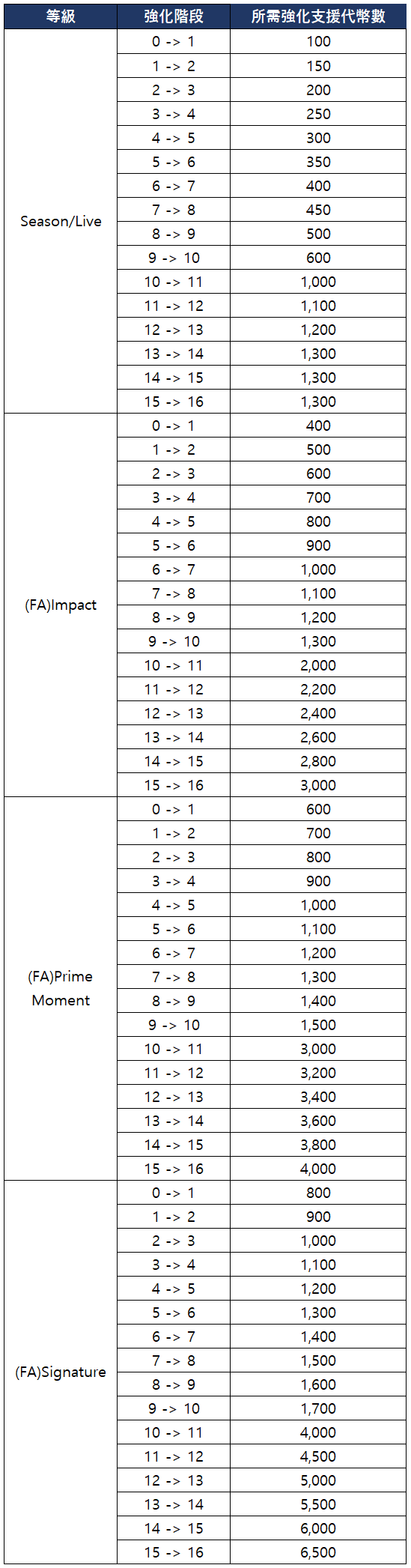 - 根據球員卡等級及強化階段,所需的強化支援代幣數量則不同。