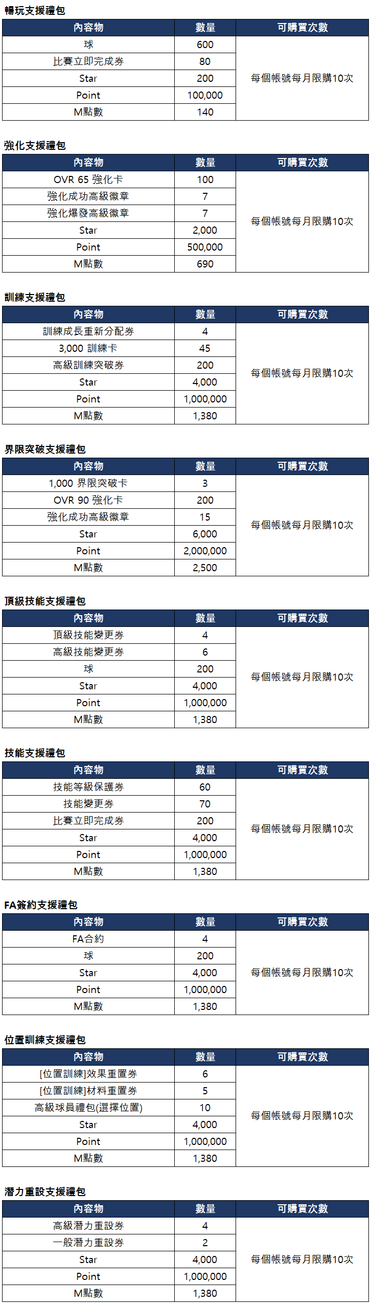 - 每月支援禮包可於球場商店 > 標準 > 特別頁籤中查看。