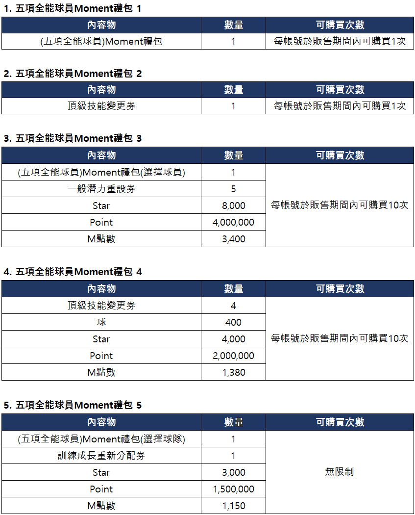- 五項全能球員Moment禮包1,2可使用Star購買。