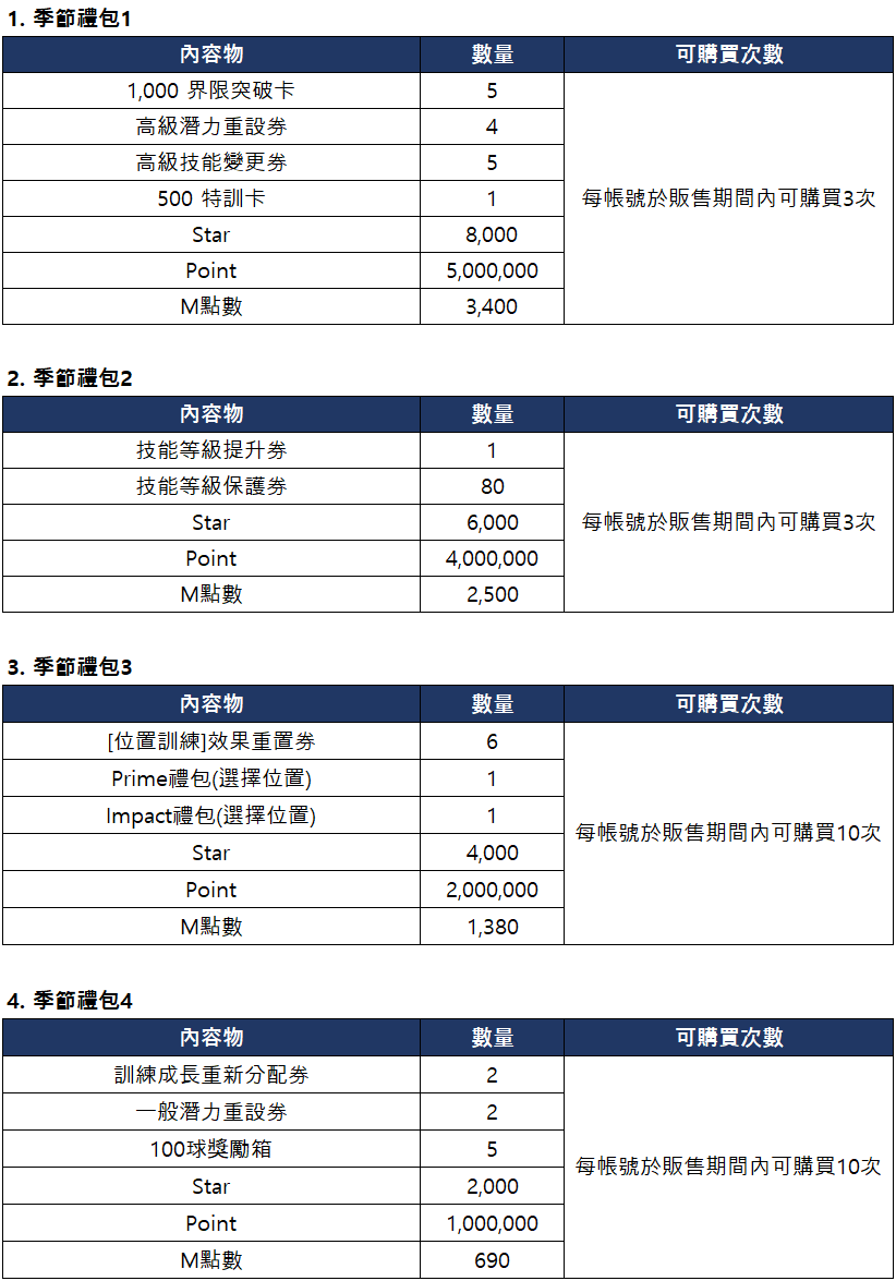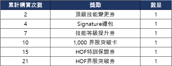 - 根據季節禮包累計購買次數,將可獲得以下獎勵。