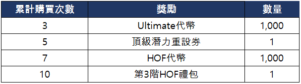 - 根據第3階HOF特別禮包累計購買次數,將可獲得以下獎勵。