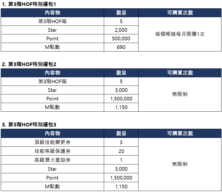 - 購買第3階HOF特別禮包所累計的「累計購買次數」,將不會累計至下一階HOF禮包中。