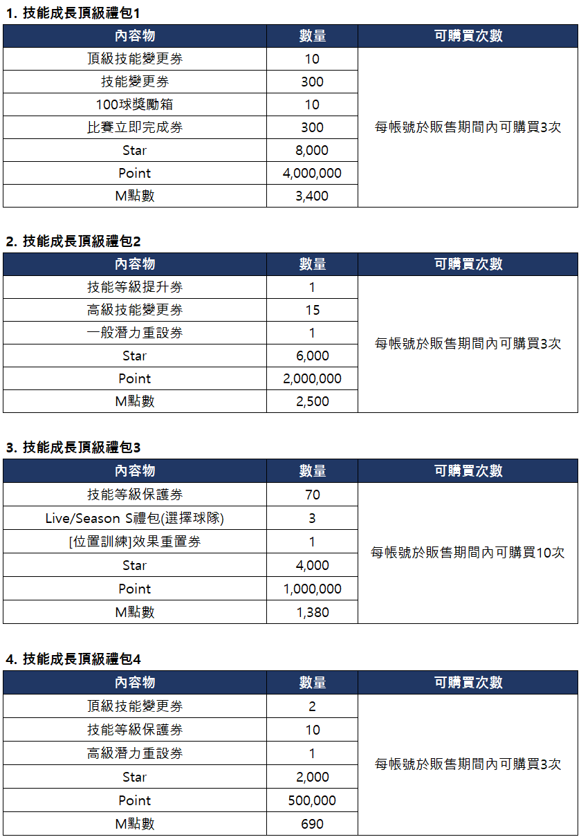 - 根據技能成長頂級禮包累計購買次數,將可獲得以下獎勵。
