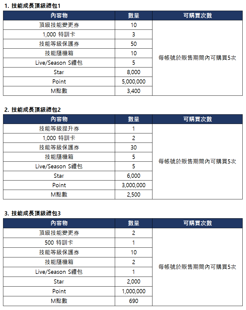 - 根據技能成長頂級禮包累計購買次數,將可獲得以下獎勵。