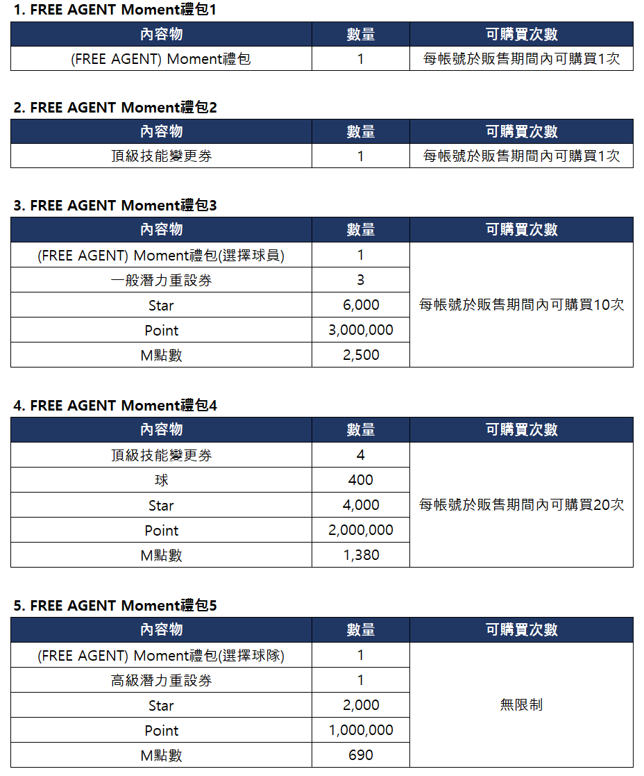 - FREE AGENT Moment禮包1,2可使用Star購買。