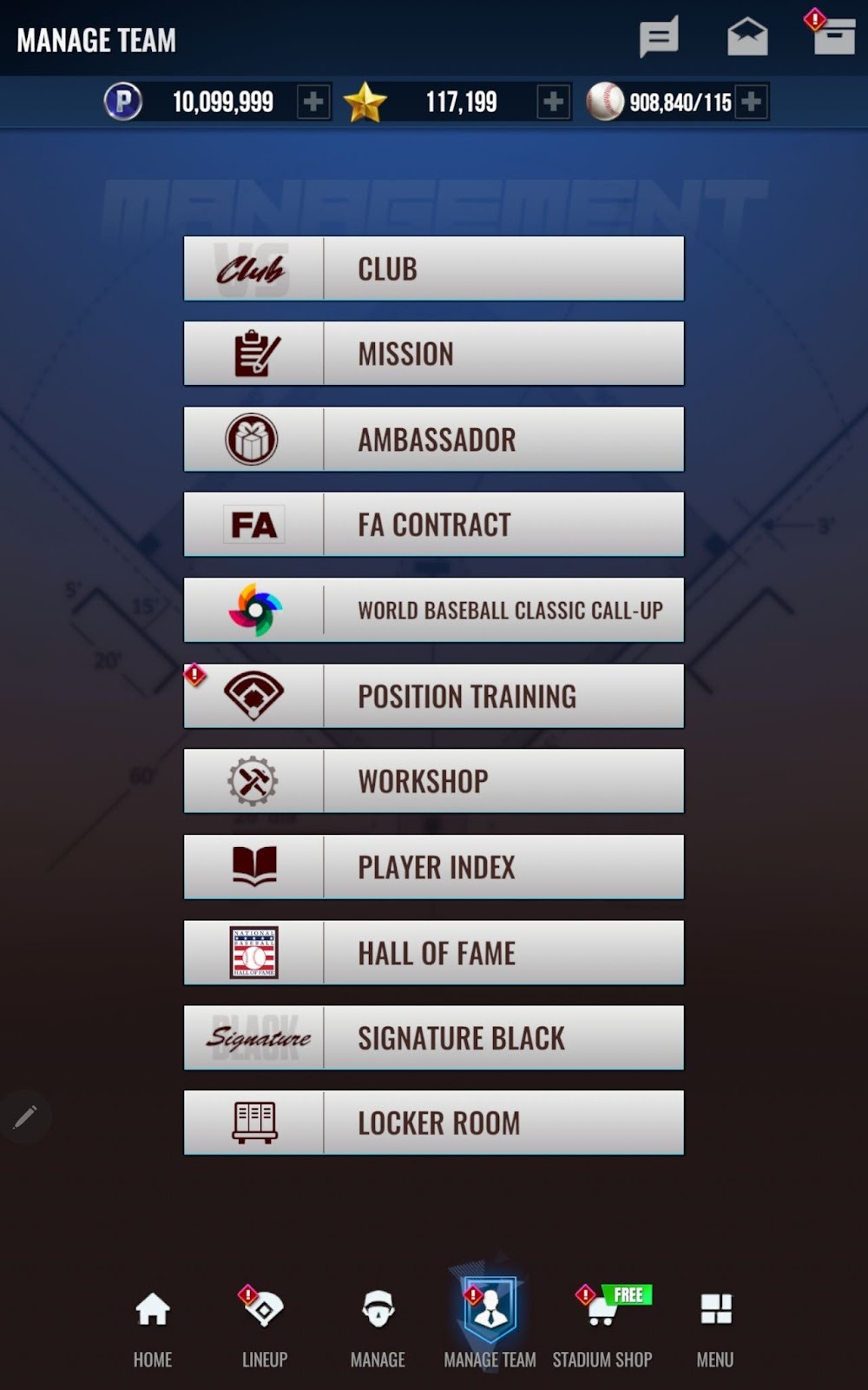 ex) 達成Signature卡強化Lv.25時,OVR+25 / 達成World Baseball Classic Signature卡強化Lv.25時,OVR+21(與FA Signature相同)