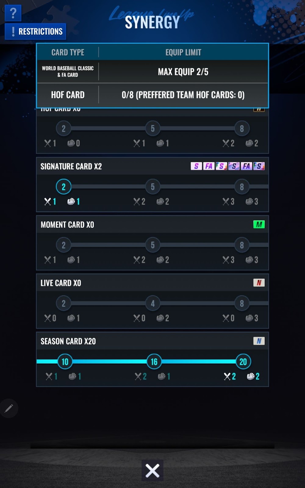 - FA及World Baseball Classic卡片可於陣容中使用最多5名球員。