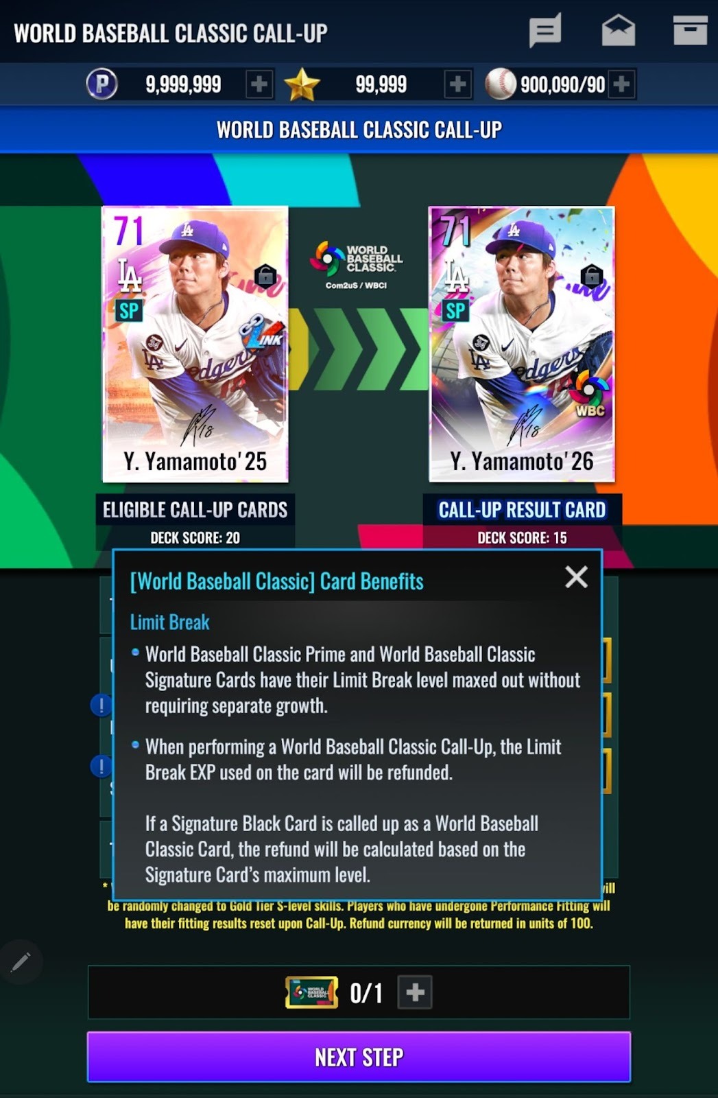 - World Baseball Classic球員卡不需進行界限突破即可擴張強化等級上限,於獲得或徵召時可最多強化至等級Lv.20。