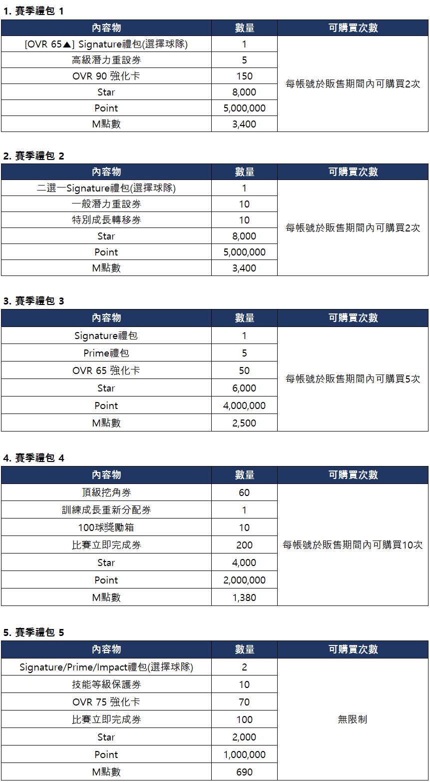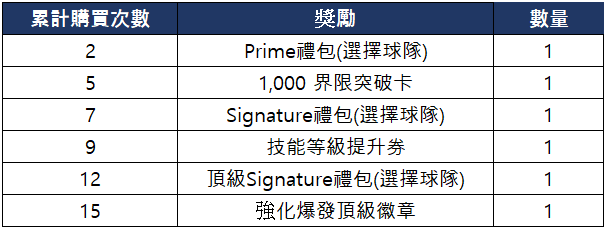 - 根據賽季禮包累計購買次數,將可獲得以下獎勵。