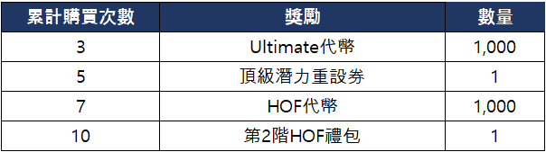 - 根據第2階HOF特別禮包累計購買次數,將可獲得以下獎勵。