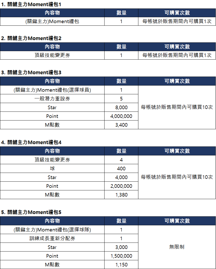 - 關鍵主力Moment禮包1,2可使用Star購買。