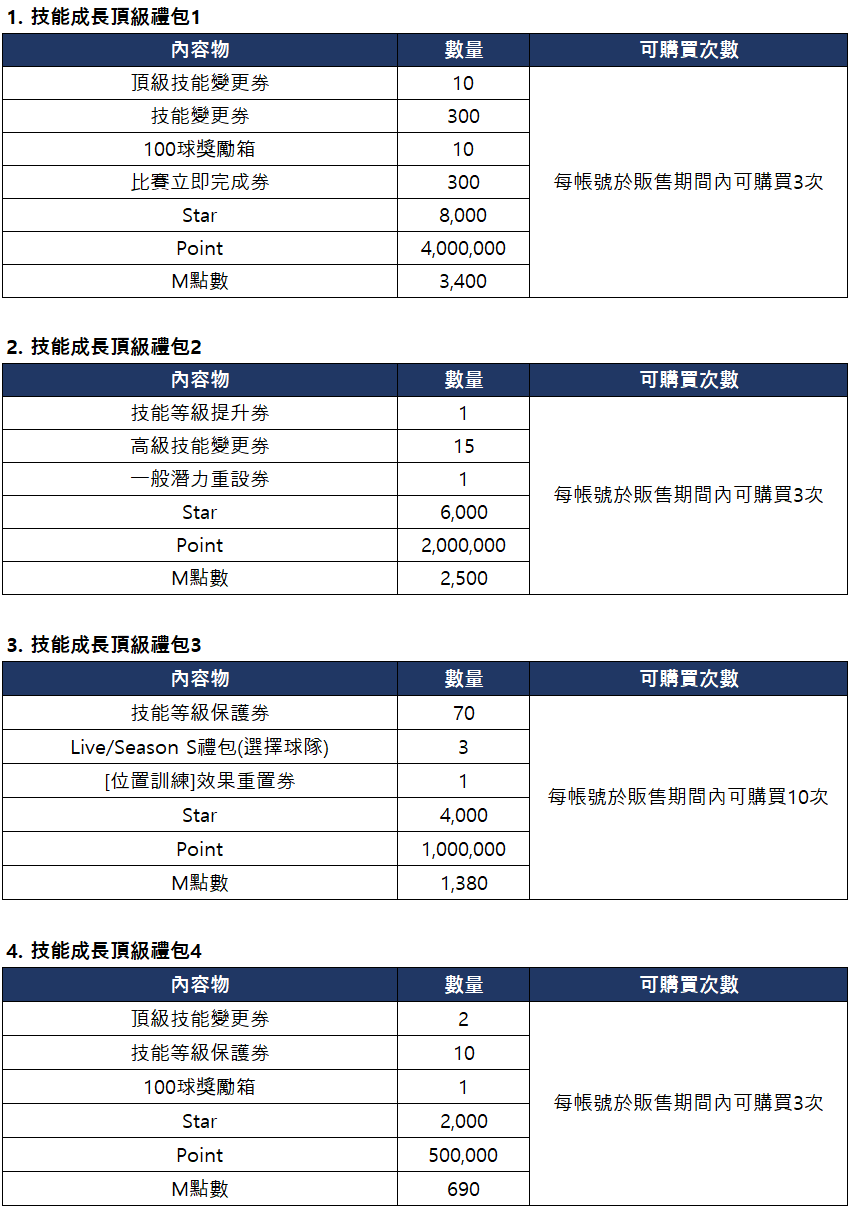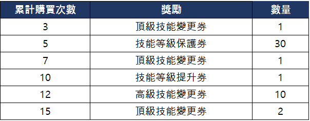 - 根據技能成長頂級禮包累計購買次數,將可獲得以下獎勵。