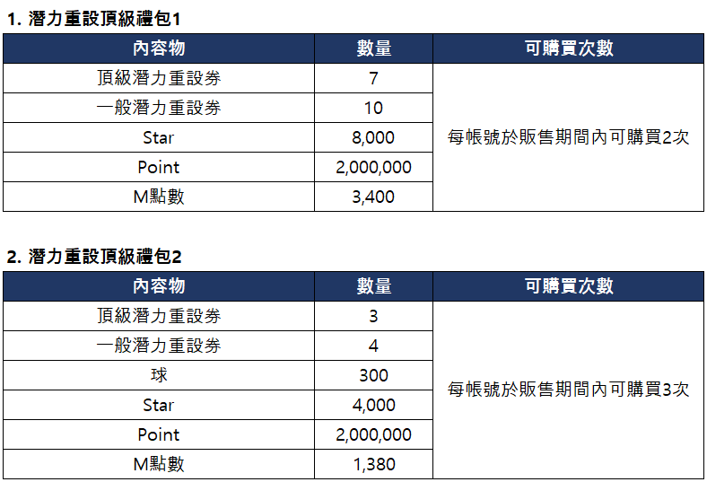 ■ 潛力重設頂級禮包上架通知
