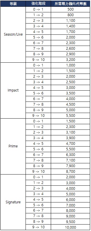 ▼ 各球員卡等級/強化階段所需的強化代幣數量
