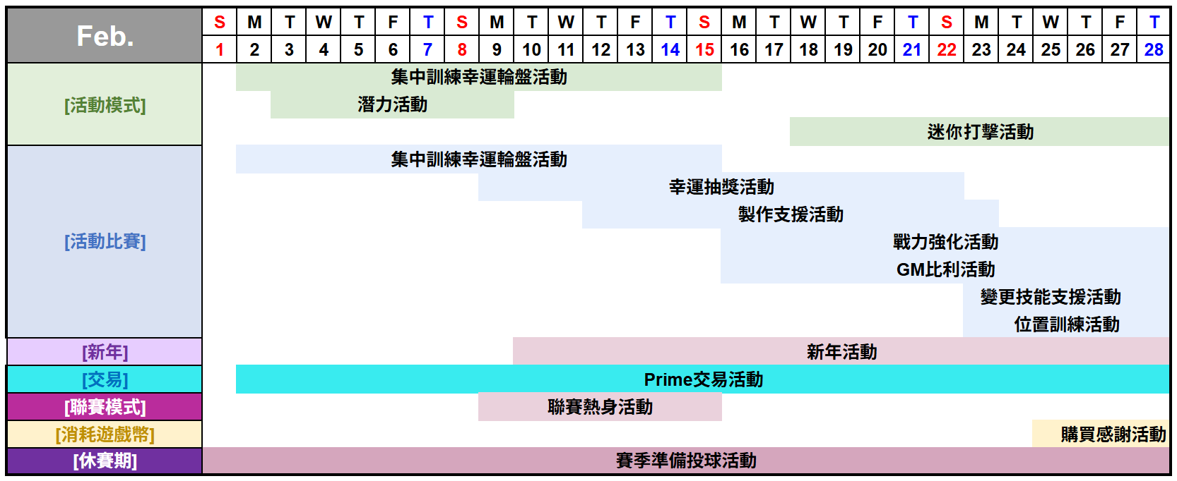 [活動比賽] | 戰力強化活動 | 2月15日 23:00 | 2月28日 22:59 | 14日 |