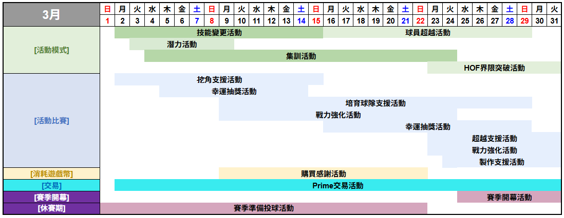 [活動比賽] | 培育球隊支援活動 | 3月8日 23:00 | 3月29日 22:59 | 21日 |