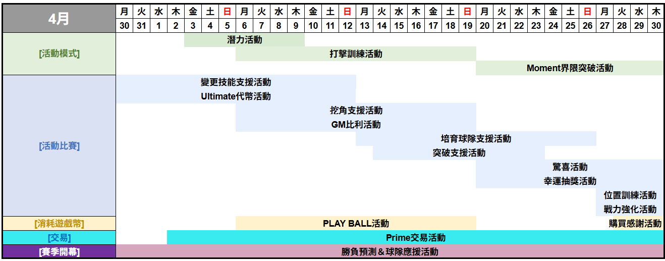 [活動模式] | 打擊訓練活動 | 4月5日 23:00 | 4月19日 22:59 | 14日 |