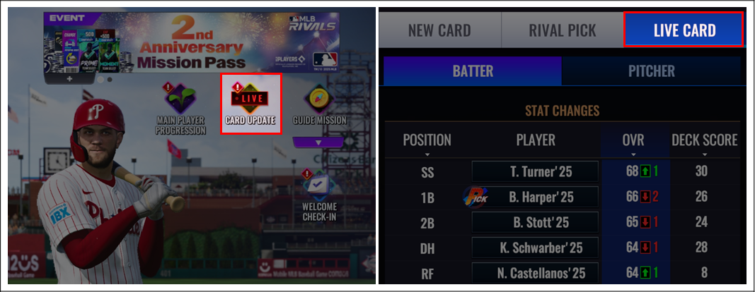 - 根據2026 MLB例行賽記錄,將針對Live球員的能力值、組合分數、位置進行變更。