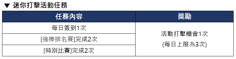 - 透過每日任務,每日最多可獲得3次活動打擊機會。