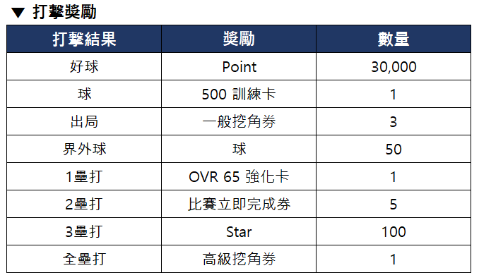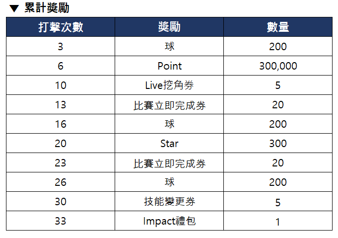 - 活動期間內,根據累計活動打擊次數,可獲得獎勵。