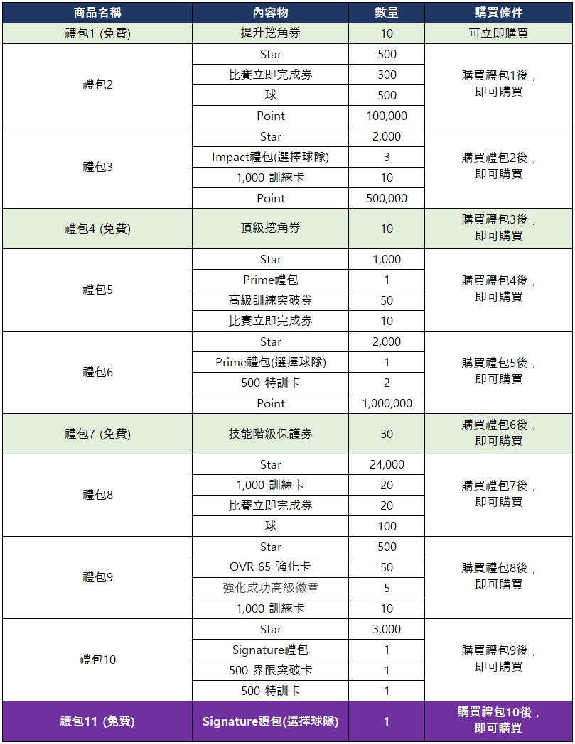 - 需先購買前一階段的所有禮包後,才可購買下一階段的禮包。