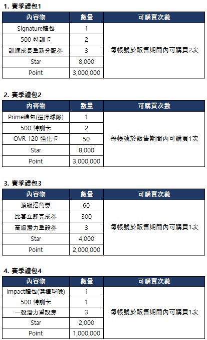 以下為包含Signature禮包及Prime禮包(選擇球隊)特別成長道具的[賽季禮包]相關通知。