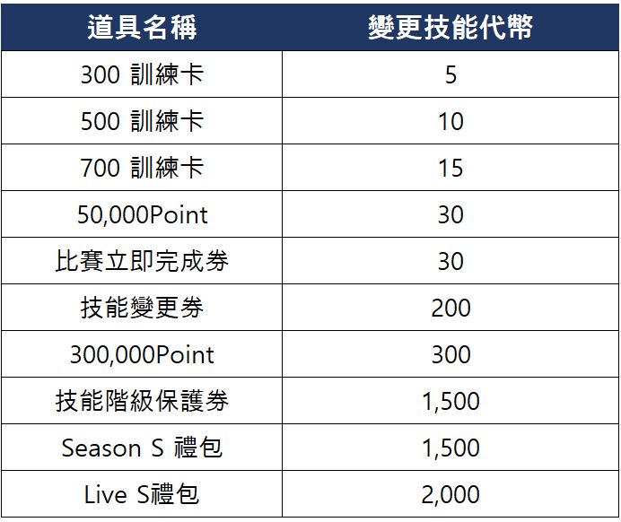 - 進行變更技能支援活動比賽期間,可於活動商店購買以下商品。