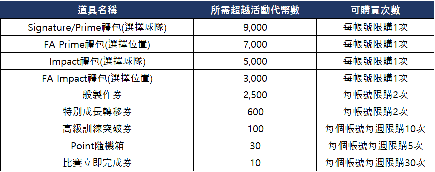 - 活動比賽進行期間,可至活動商店購買以下商品。