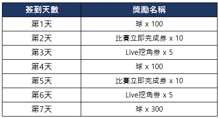 於活動期間登入遊戲7日,即可帶走球x500及比賽立即完成券x20等豐富好禮~!