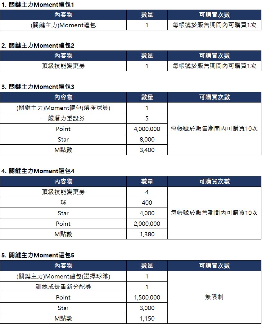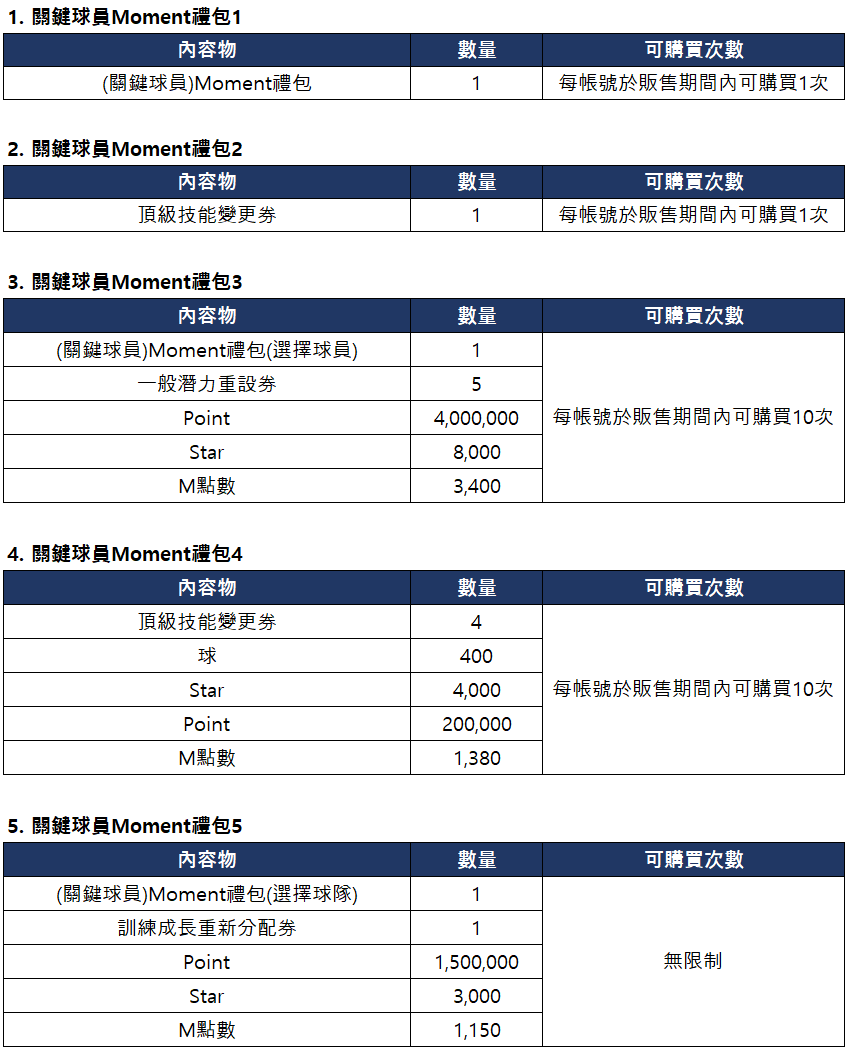 - 關鍵球員Moment禮包1,2可使用Star購買。