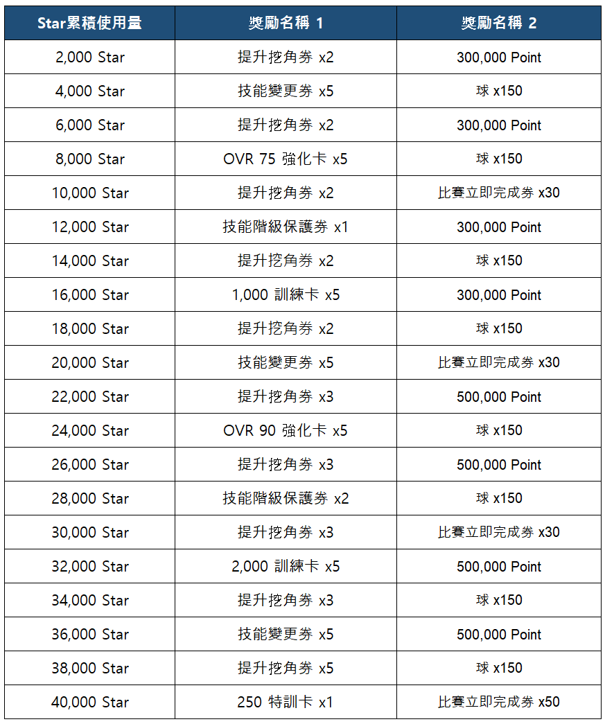 活動期間內,可根據‘Star使用量’獲得以下獎勵。