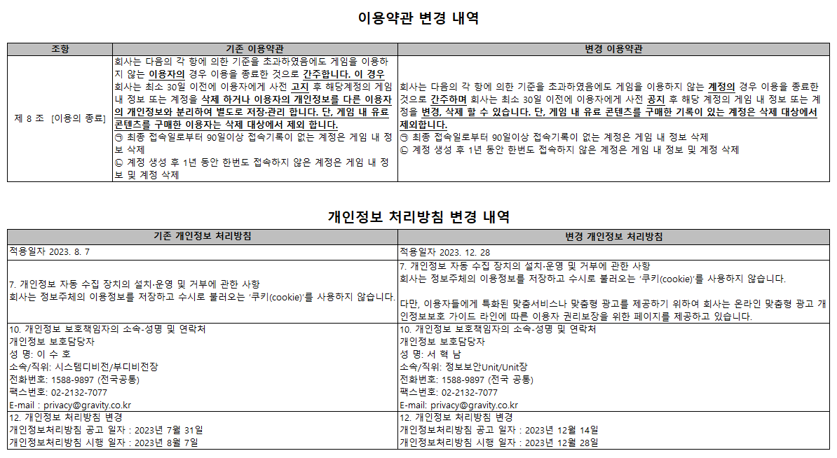 - 변경된 이용약관 및 개인정보 처리방침 내용에 대한 문의와 이의제기는 고객센터 또는 문의하기로 접수하여 주시기 바랍니다.