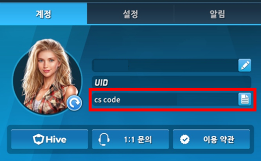 - CS Code 확인 방법 : 게임 내 [메뉴] - [환경 설정] - [계정]