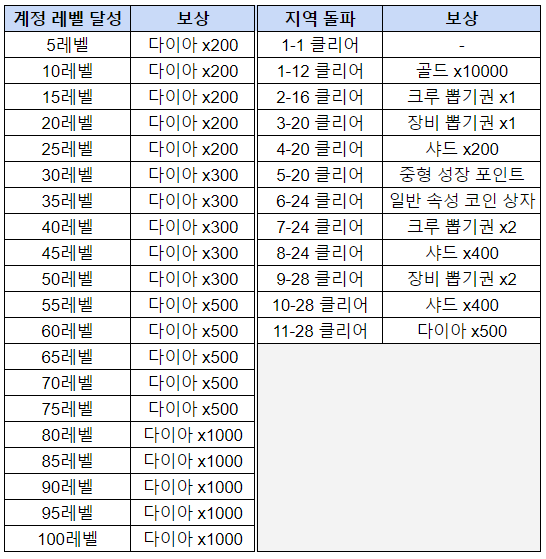 - 특정 계정 레벨을 달성하고, 지역을 돌파할 때마다 보상을 획득 할 수 있어요!