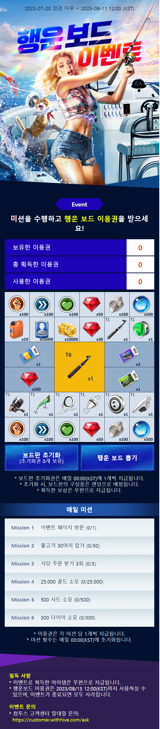 - 행운보드 이용권은 2023/08/13 12:00(KST)까지 사용하실 수 있으며, 이벤트가 종료되면 모두 사라집니다.