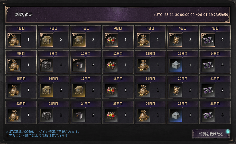 - ログインボーナス報酬は、1アカウントにつき1回のみ獲得可能であり、同一アカウント内でキャラクターを切り替えての受け取りはできません。