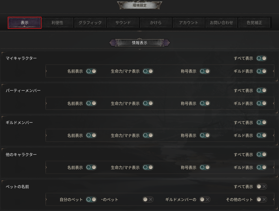 - プレイ画面に表示される自分のキャラクターやパーティメンバーなど、