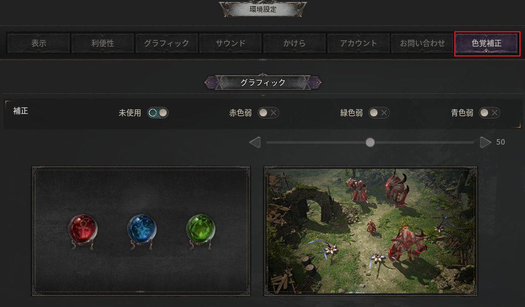 - 赤色、緑色、青色などの色覚補正を設定できます。