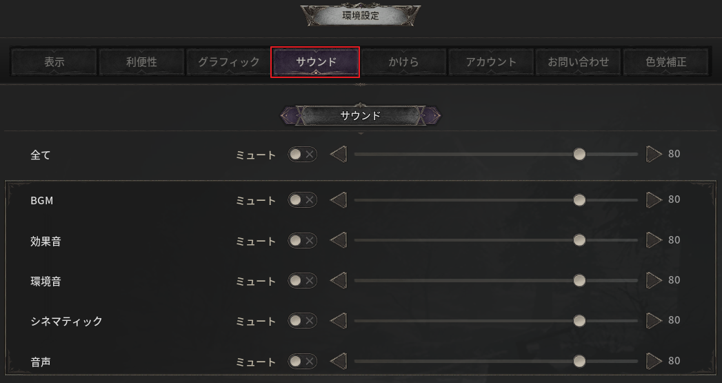 - ゲームプレイ中の全体音量をはじめ、BGM や効果音などの音量を調整できます。