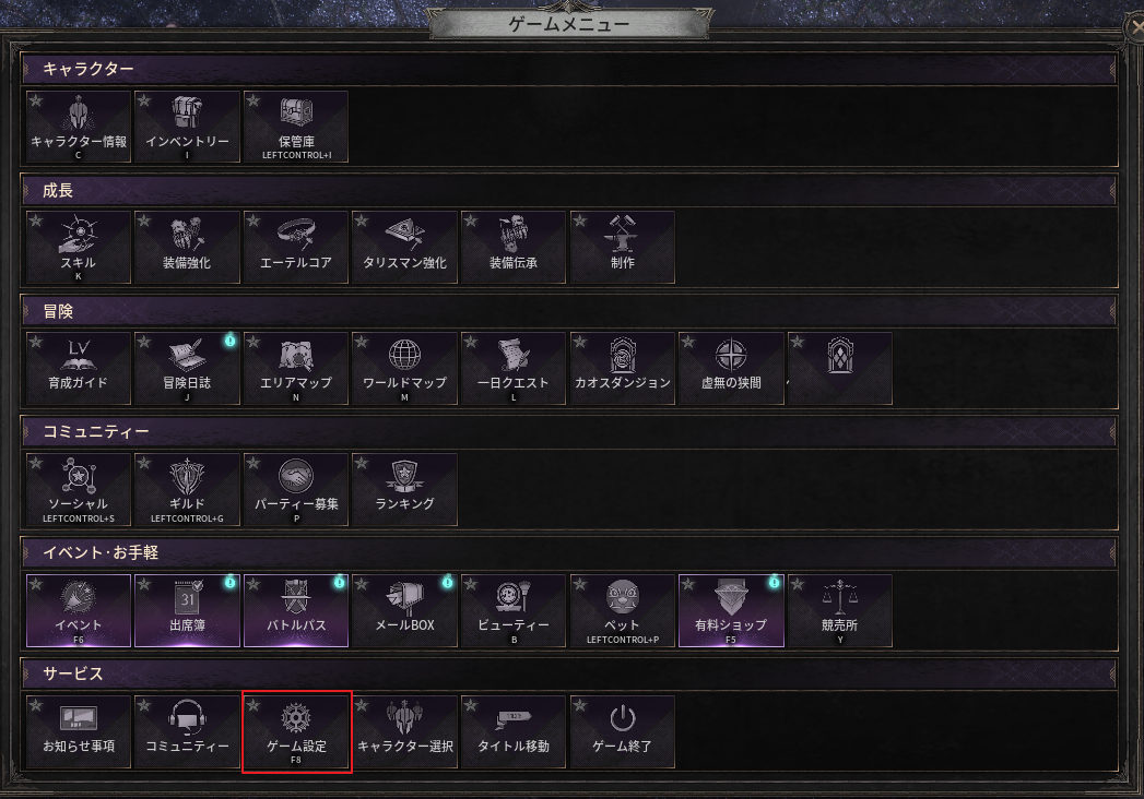 - ゲームにログイン後、Esc キーを押すか、
