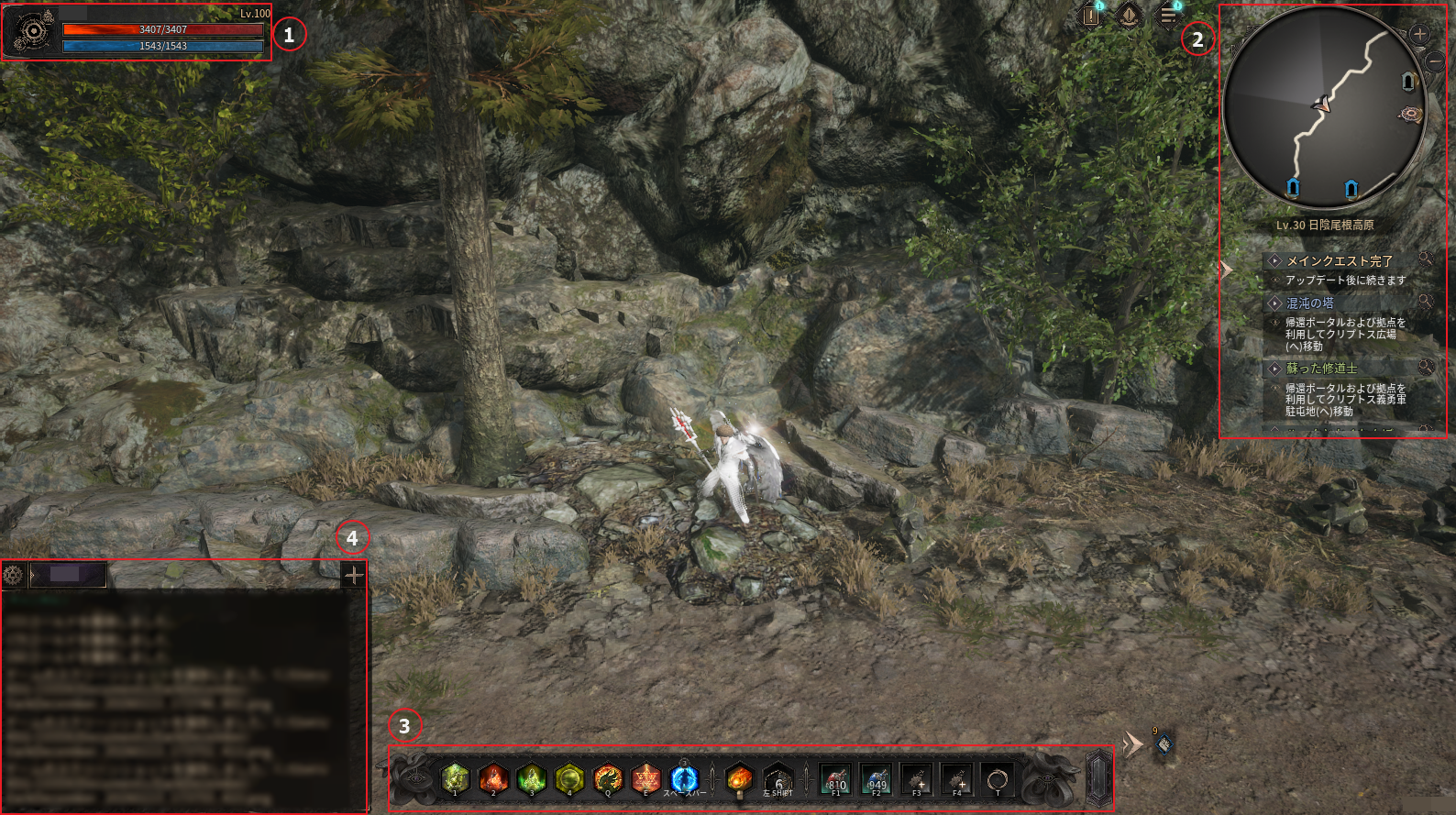 ① キャラクターの名前、レベル、生命力(HP)、マナ(MP)を確認できます。