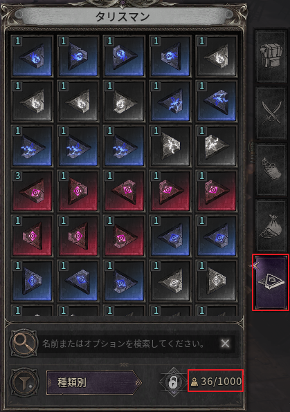 - タリスマンインベントリー:タリスマン専用の保管バッグで、所持上限は最大1,000個までです。