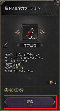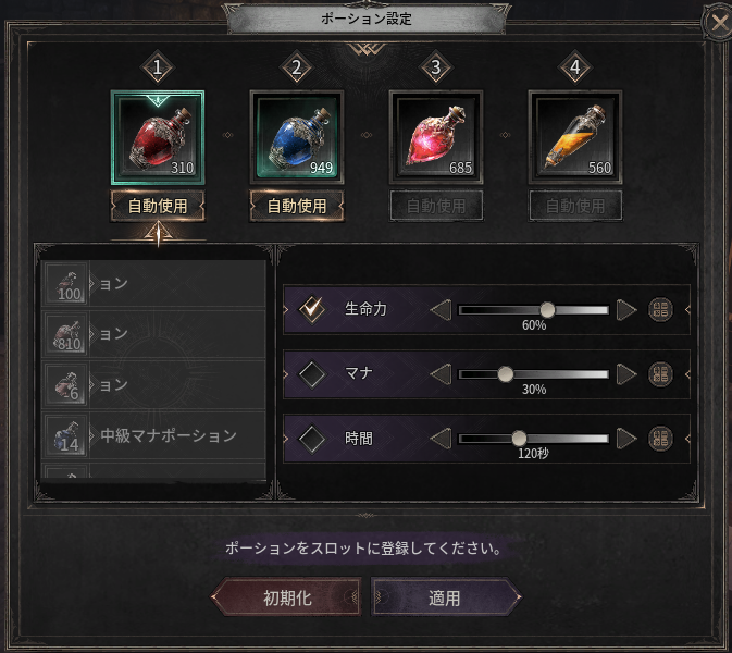 - インベントリーでポーションを選択し、下部の装着ボタンをクリックする、またはキャラクター情報画面下部のポーション欄を右クリックすると、自動ポーション設定のポップアップを確認できます。